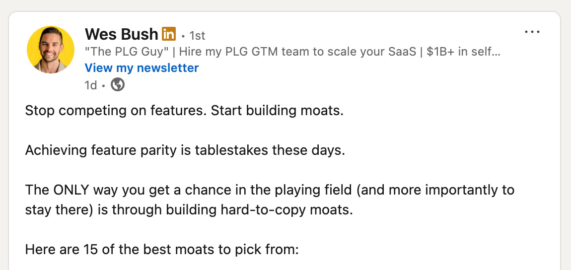 In today’s SaaS world, feature parity is table stakes. Wes Bush shares 15 powerful moats that create real, lasting advantage - from user experience and network effects to switching costs and founder brand.